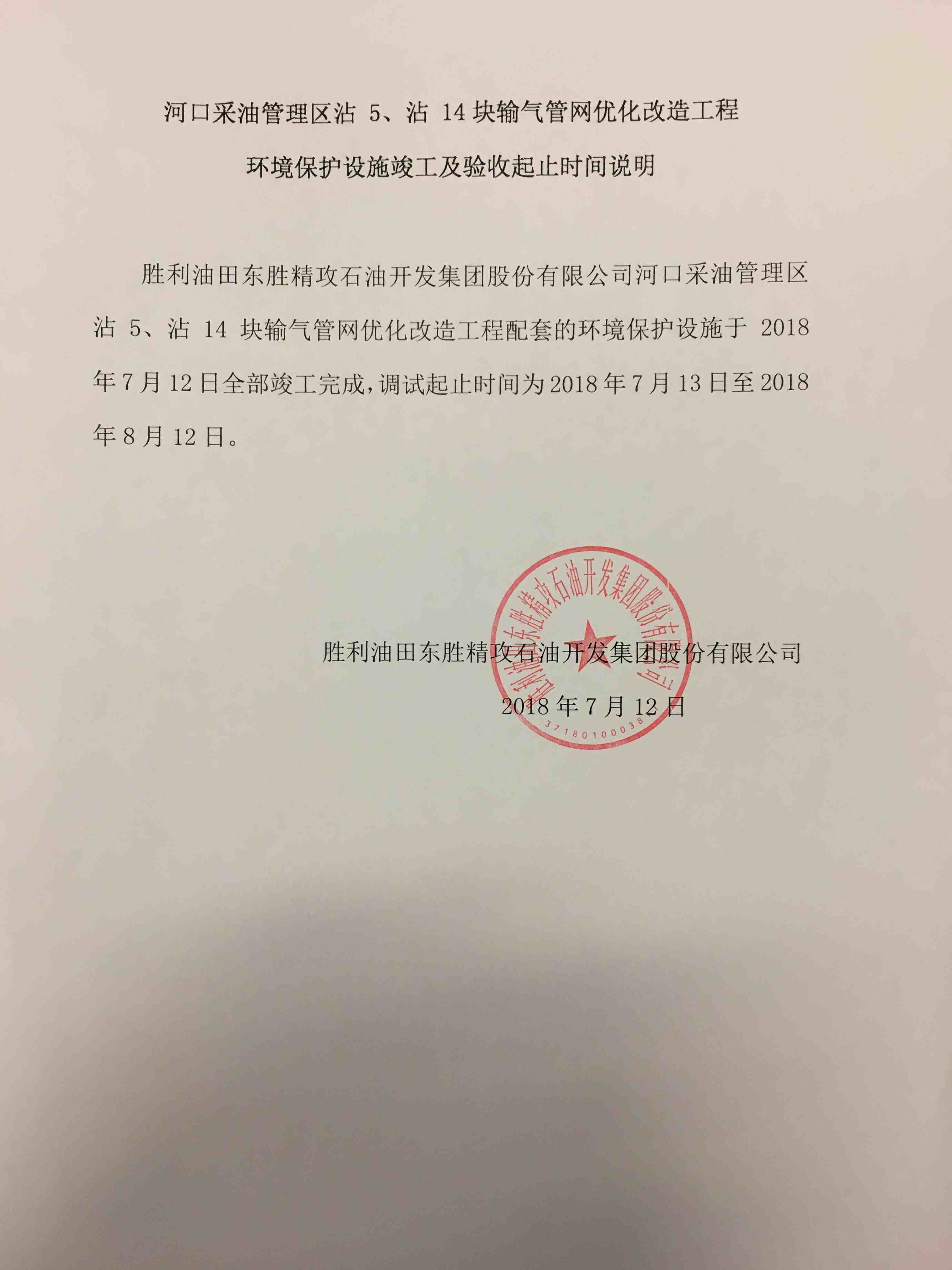 河口采油管理區沾5、沾14塊輸氣管網優化改造工程環境保護設施竣工及驗收起止時間說明
