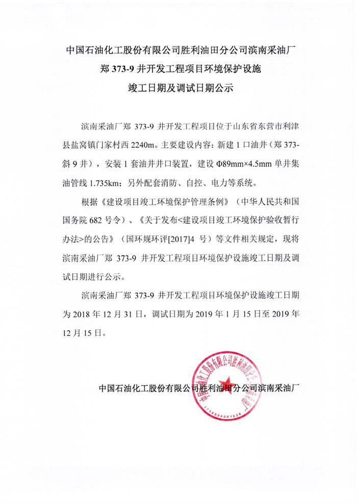 中國石油化工股份有限公司勝利油田分公司濱南采油廠鄭373-9井開發工程項目環境保護設施竣工日期及調試日期公示